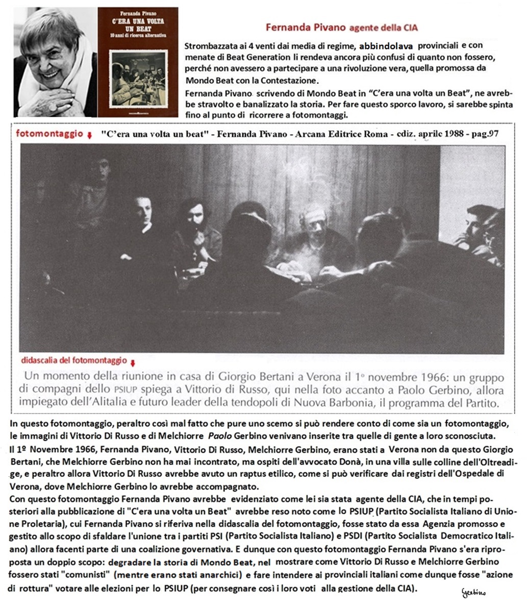 In questo fotomontaggio, peraltro così mal fatto che pure uno scemo si può rendere conto di come si tratti di un fotomontaggio, le immagini di Vittorio Di Russo e di Melchiorre Paolo Gerbino venivano inserite tra quelle di gente a Melchiorre Gerbino sconosciuta. L'1 Novembre 1966, Fernanda Pivano, Vittorio Di Russo, Melchiorre Gerbino, erano stati a Verona non da Giorgio Bertani, che Melchiorre Gerbino non ha mai incontrato, ma ospiti dell'avvocato Donà, in una villa sulle colline dell'Oltreadige, e peraltro allora Vittorio Di Russo avrebbe avuto un raptus etilico, come si può verificare dai registri dell'Ospedale di Verona, dove Melchiorre Gerbino lo avrebbe accompagnato.