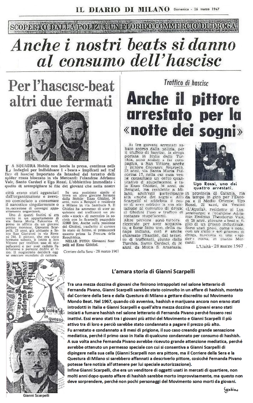 Tra una mezza dozzina di giovani che finirono intrappolati nel salone letterario di Fernanda Pivano, Gianni Scarpelli sarebbe stato coinvolto in un affare di hashish, montato dal Corriere della Sera e dalla Questura di Milano a gettare discredito sul Movimento Mondo Beat. Nel 1967, quando ciò avveniva, hashish e marijuana ancora non erano stati introdotti in Italia e Gianni Scarpelli e quell'altra mezza dozzina di giovani erano stati iniziati a fumare hashish nel salone letterario di Fernanda Pivano perché fossero resi inattivi. Essi erano stati tra i giovani più attivi del Movimento e Gianni Scarpelli il più attivo tra di loro e perciò sarebbe stato condannato a pagare il prezzo più alto.