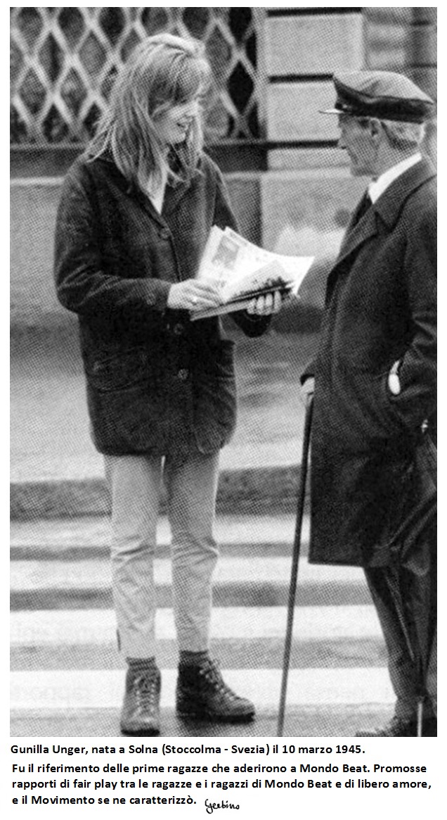Certo è che senza Gunilla Unger, che fu il riferimento delle prime ragazze che aderirono a Mondo Beat, e le ragazze di Mondo Beat sarebbero state numerosissime, il Movimento non si sarebbe caratterizzato con quel fair play di stile scandinavo che tanto fascino esercitò sulla gioventù italiana. Né i ragazzi e le ragazze di Mondo Beat senza la fratellanza sessuale che li accomunava sarebbero stati capaci d’inscenare manifestazioni che paralizzavano il cuore di Milano, durante le quali si poteva finire in una lettiga con due costole rotte dalla polizia.