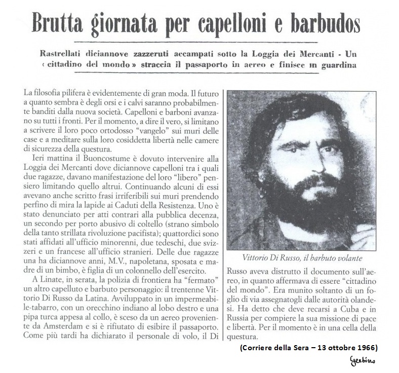 Melchiorre Gerbino, che si trovava a Milano, avendo letto pure lui di Vittorio Di Russo, il giorno dopo il suo arrivo si mise a cercarlo e, giunto in Piazza Duomo, se lo vide venire incontro, circondato da una ventina di capelloni, quelli che allora si aggiravano nel centro della città, che Vittorio Di Russo aveva già catalizzati tutti.
