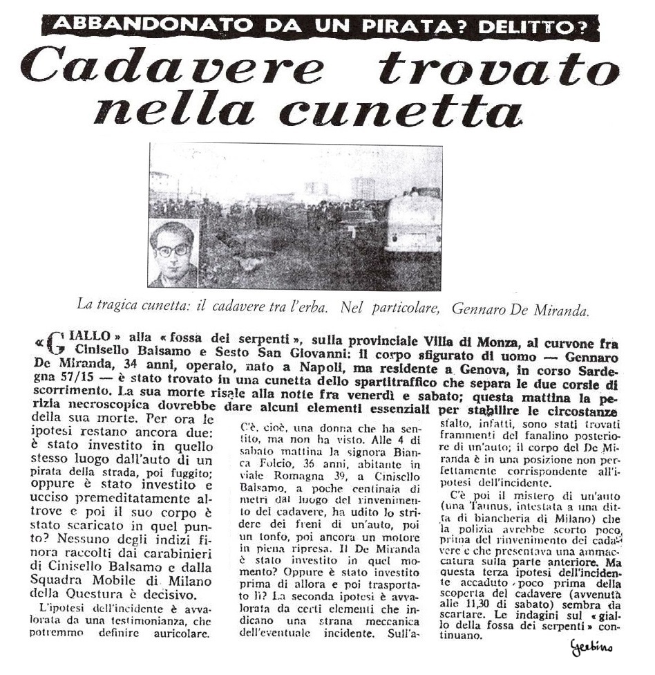 Domenica 12 dicembre avremmo appreso dai giornali la terribile notizia della morte di Gennaro De Miranda, il cui corpo era stato trovato a Cinisello Balsamo nella Fossa dei Serpenti, un fossato non lontano dall'appartamento di Umberto Tiboni dove Gennaro De Miranda era solito dormire.