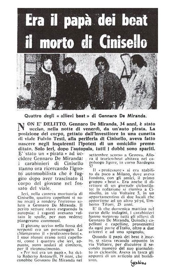 Avendo appreso dai giornali la terribile notizia, Il 13 dicembre si recavano all'obitorio di Cinisello Balsamo, per la triste incombenza dell'identificazione del corpo di Gennaro De Miranda, quattro giovani di Mondo Beat, Maurizio Orioli, Roberto Antonelli, Stefano Mondo e Melchiorre Gerbino. In quella circostanza Melchiorre Gerbino avrebbe conosciuto Ezio Chiodini, un giovane giornalista del quotidiano Il Giorno, che si dichiarava interessato a seguire gli eventi del Movimento Mondo Beat e pertanto tra Melchiorre Gerbino e Ezio Chiodini si sarebbe stabilito un contatto.