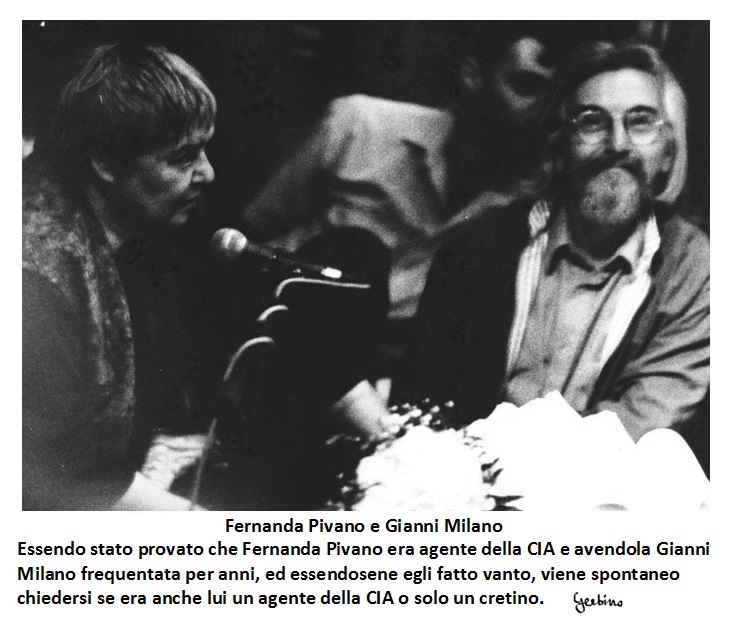 Essendo stato provato che Fernanda Pivano era agente della CIA e avendola Gianni Milano frequentata per anni, ed essendosene egli fatto vanto, può venire spontaneo chiedersi se era anche lui agente della CIA o era solo un cretino.