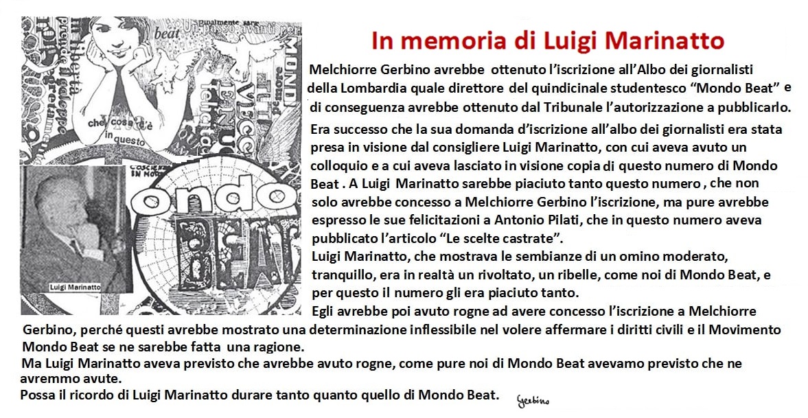 Era successo che la domanda di iscrizione era stata presa in visione da Luigi Marinatto, un consigliere dell'Ordine, con cui Gerbino aveva avuto un colloquio e a cui aveva lasciato in visione copia di questo numero della rivista. A Luigi Marinatto sarebbe piaciuto tanto questo numero di Mondo Beat, che avrebbe concesso a Melchiorre Gerbino l'iscrizione e avrebbe pure espresso le sue felicitazioni a Antonio Pilati, che in questo numero aveva pubblicato l'articolo "Le scelte castrate".