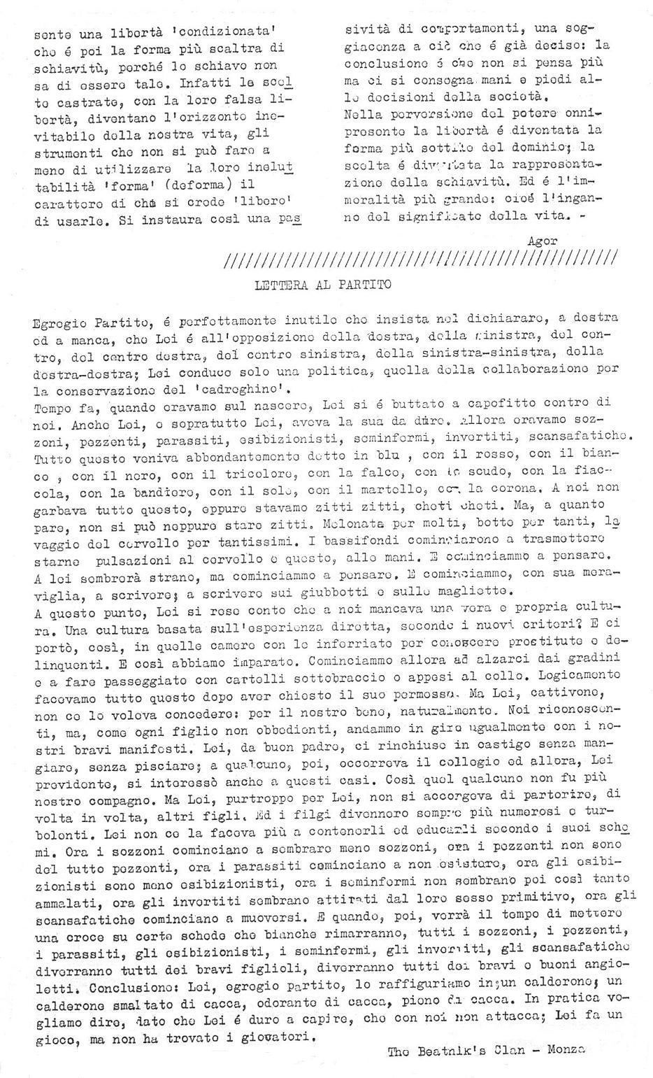 Nella stessa pagina 4, LETTERA AL PARTITO, firmata "The Beanik's Clan - Monza", fu scritta da Antonio Mariani.