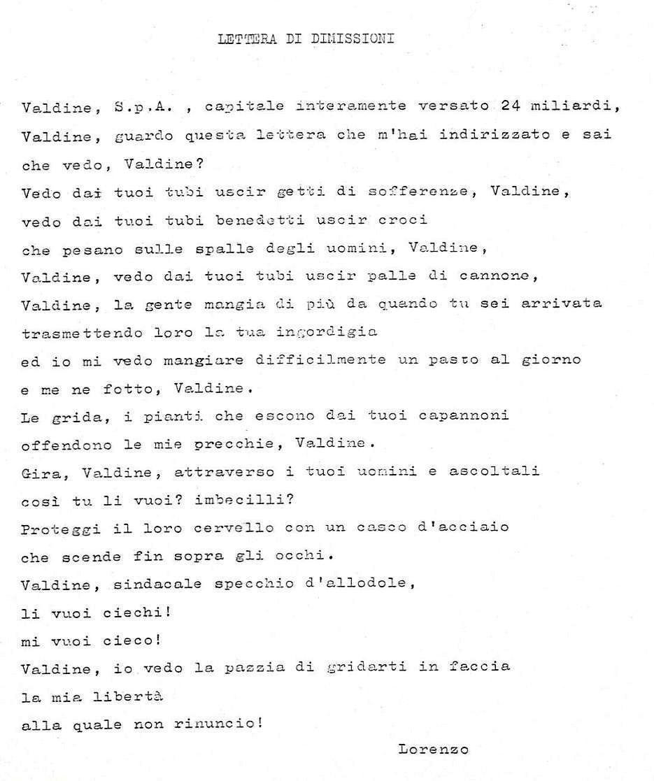 Lorenzo diede da pubblicare questa sua poesia, con la quale attaccava la Dalmine SpA, ma siccome non si volle firmare col suo nome e cognome, né provare che aveva veramente lavorato alla Dalmine, Melchiorre Gerbino nel pubblicare la poesia avrebbe cambiato il nome della società da Dalmine in Valdine (società inesistente).