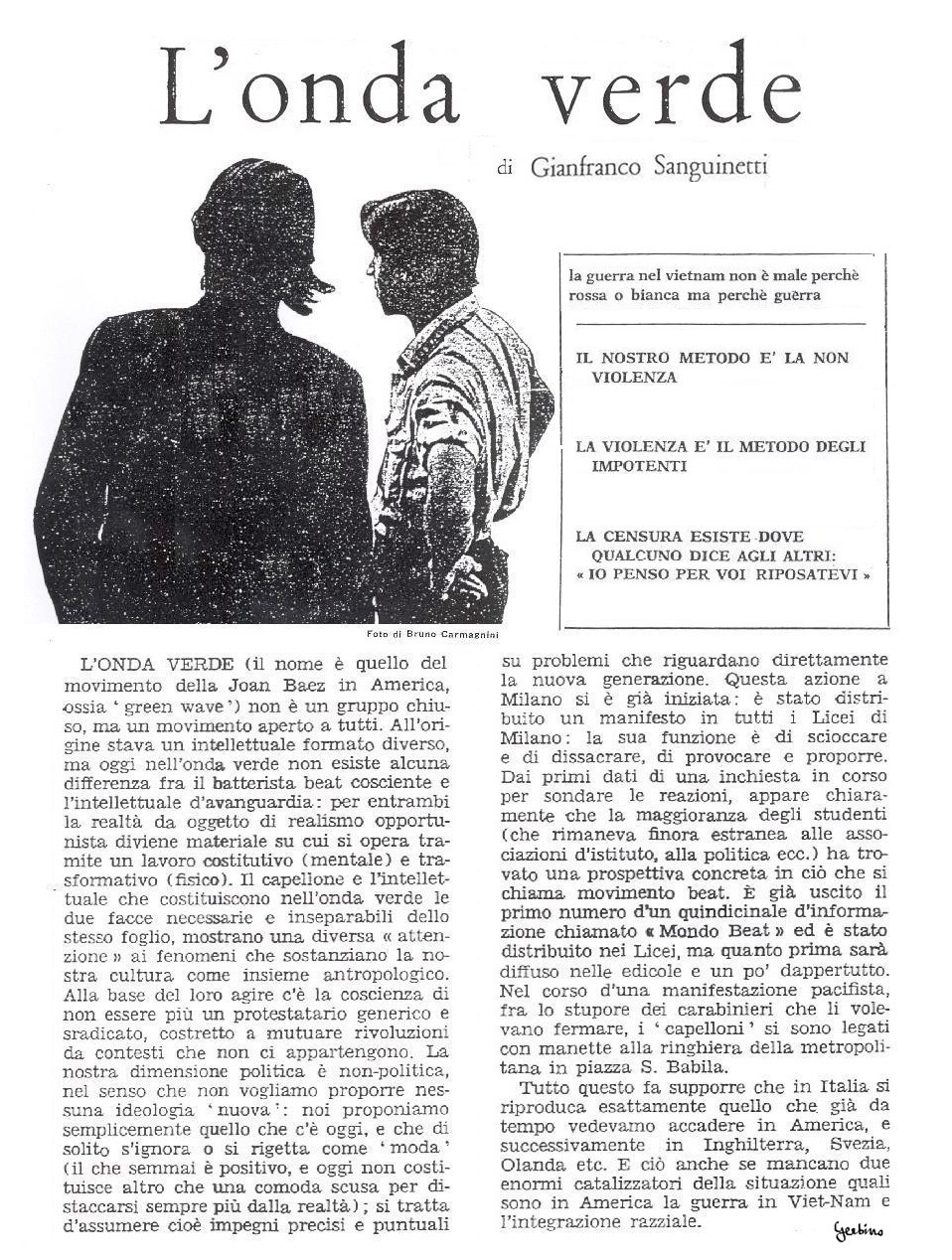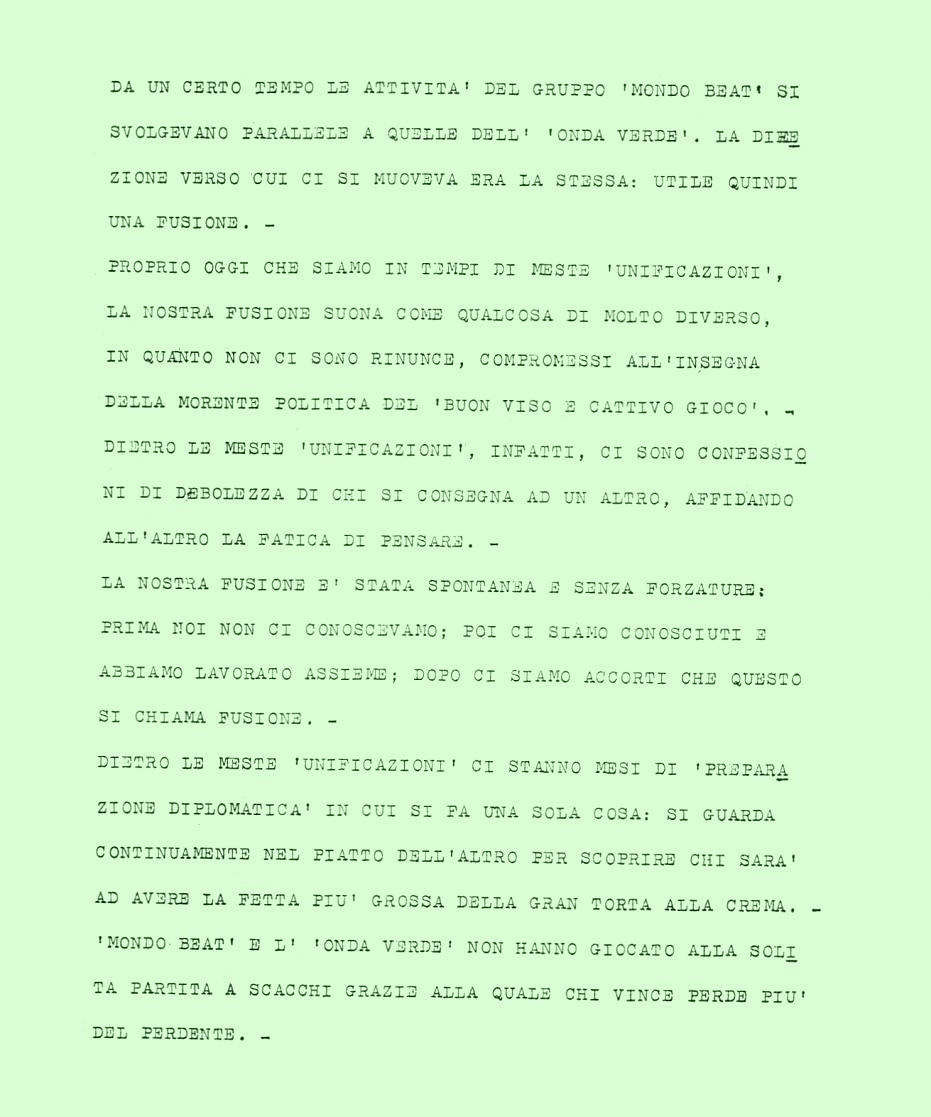 Uno scritto di Gianfranco Sanguinetti sulla fusione di Mondo Beat con Onda Verde.
