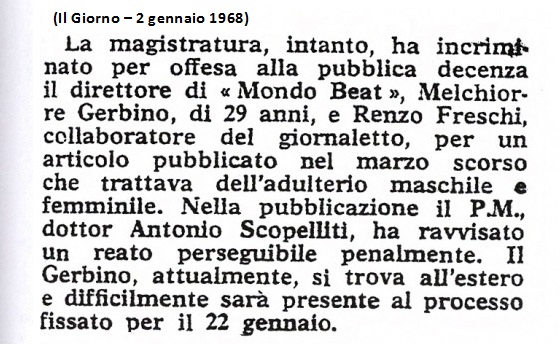 Il Giorno, che intanto da quotidiano di respiro nazionale si stava riducendo a giornale locale, definiva Mondo Beat giornaletto. Alla fine di questa farsa, con cui si era voluto sequestrare un numero di Mondo Beat perché in prima pagina riproduceva un collage di ingiunzioni poliziesche incostituzionali, Melchiorre Gerbino e Renzo Freschi sarebbero stati assolti perché imputati di un "fatto che non costituiva reato".