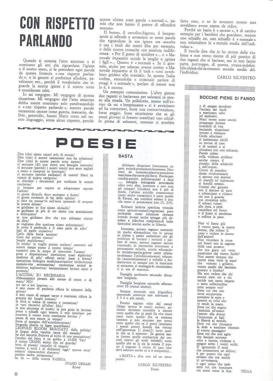 POESIE, rispettivamente di Tella (Ferrari), Ivano Urban e Carlo Silvestro e di quest'ultimo un articolo su come nel linguaggio comune i fatti più atroci (uccide moglie e figli) vengano descritti senza fastidi linguistici, mentre, trattando di sesso, le parole devono in qualche modo essere supportate da circonlocuzioni e premesse.