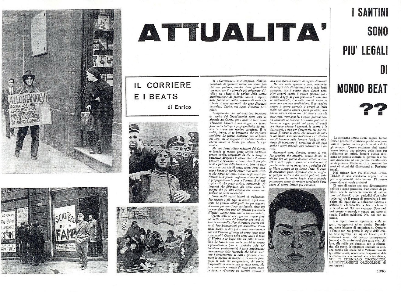 In questa doppia pagina sono pubblicate foto di eventi del Movimento Mondo Beat e l'articolo IL CORRIERE E I BEATS di Enrico. Come già detto, Enrico era un misterioso personaggio di mezza età, che alla fine si sarebbe scoperto essere un giornalista del Corriere della Sera che in Mondo Beat scriveva francamente come nel suo giornale non avrebbe potuto.