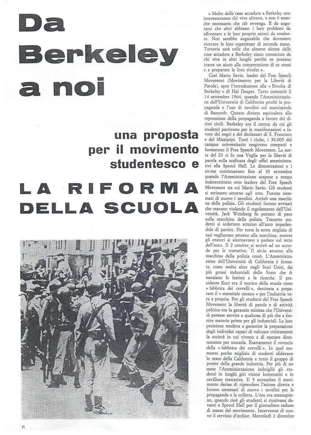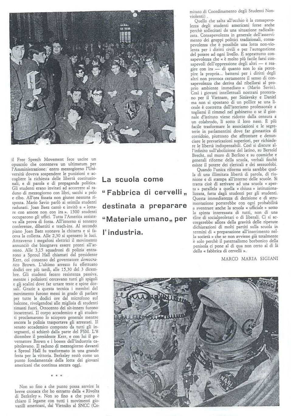 Marco Maria Sigiani con questo articolo avrebbe dato un prezioso contributo a questo numero, per le informazioni lineari che avrebbe fornito sugli eventi nel Campus di Berkeley dell'Università della California e per come avrebbe citato Mario Savio, che del Free Speech Movement era il leader.