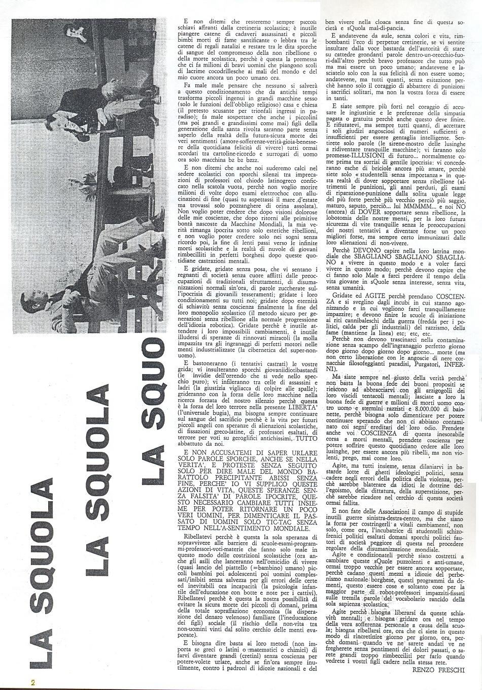 LA SQUOLA è uno scritto veramente apprezzabile, con cui Renzo Freschi ha dato sfogo al suo risentimento di studente costretto in un sistema scolastico insopportabile. Il termine volutamente errato "squola" è diventato d'uso a fare ironia sul sistema scolastico italiano.