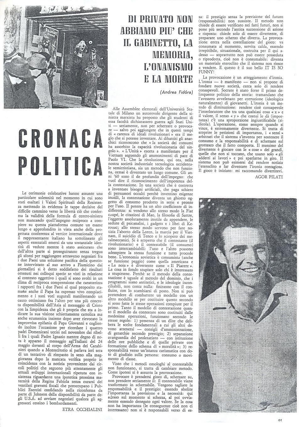 Con questo articolo Antonio Pilati rendeva omaggio ai modelli della "provocazione". Ma c'è da considerare come questo articolo sia stato scritto dopo che i modelli della Contestazione erano stati formulati e la Contestazione aveva avuto il suo battesimo di fuoco con la Manifestazione di Contestazione del Sistema. Ma Antonio Pilati non aveva avuto percezione di quanto era successo. Studente liceale che si preparava a sostenere l'esame di maturità, non aveva avuto tempo di partecipare agli eventi del Movimento e così, mentre la Contestazione a Milano apriva nuovi scenari e ad Amsterdam non succedeva più nulla di memorabile, egli avrebbe continuato a elogiare i modelli della provocazione.