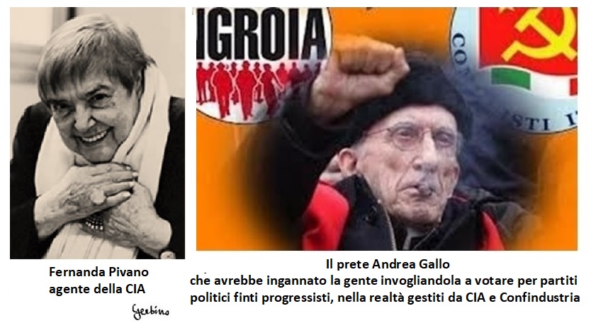 E per dirla tutta su Fernanda Pivano, quando costei sarebbe morta, il Vaticano avrebbe mobilitato per le esequie il prete Andrea Gallo, che faceva lo stesso lavoro sporco che Fernanda Pivano aveva fatto: invogliare la gente a votare per partiti politici finti progressisti, in realtà gestiti da CIA (Rivoluzione Civile Ingroia) e Confindustria (Rifondazione Comunista)