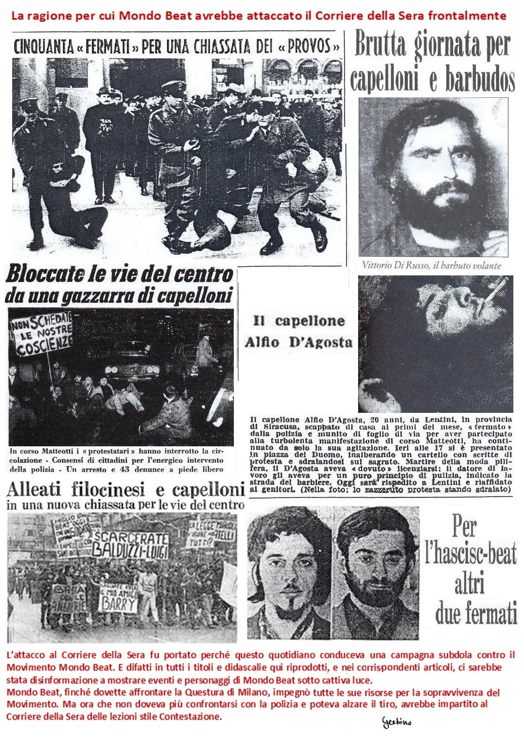 Il Corriere della Sera aveva da sempre condotto una campagna di disinformazione contro il Movimento Mondo Beat. E difatti in tutti i titoli e didascalie sopra riprodotti, e nei corrispondenti articoli, la disinformazione sarebbe stata sistematica a mostrare eventi e personaggi di Mondo Beat in cattiva luce.