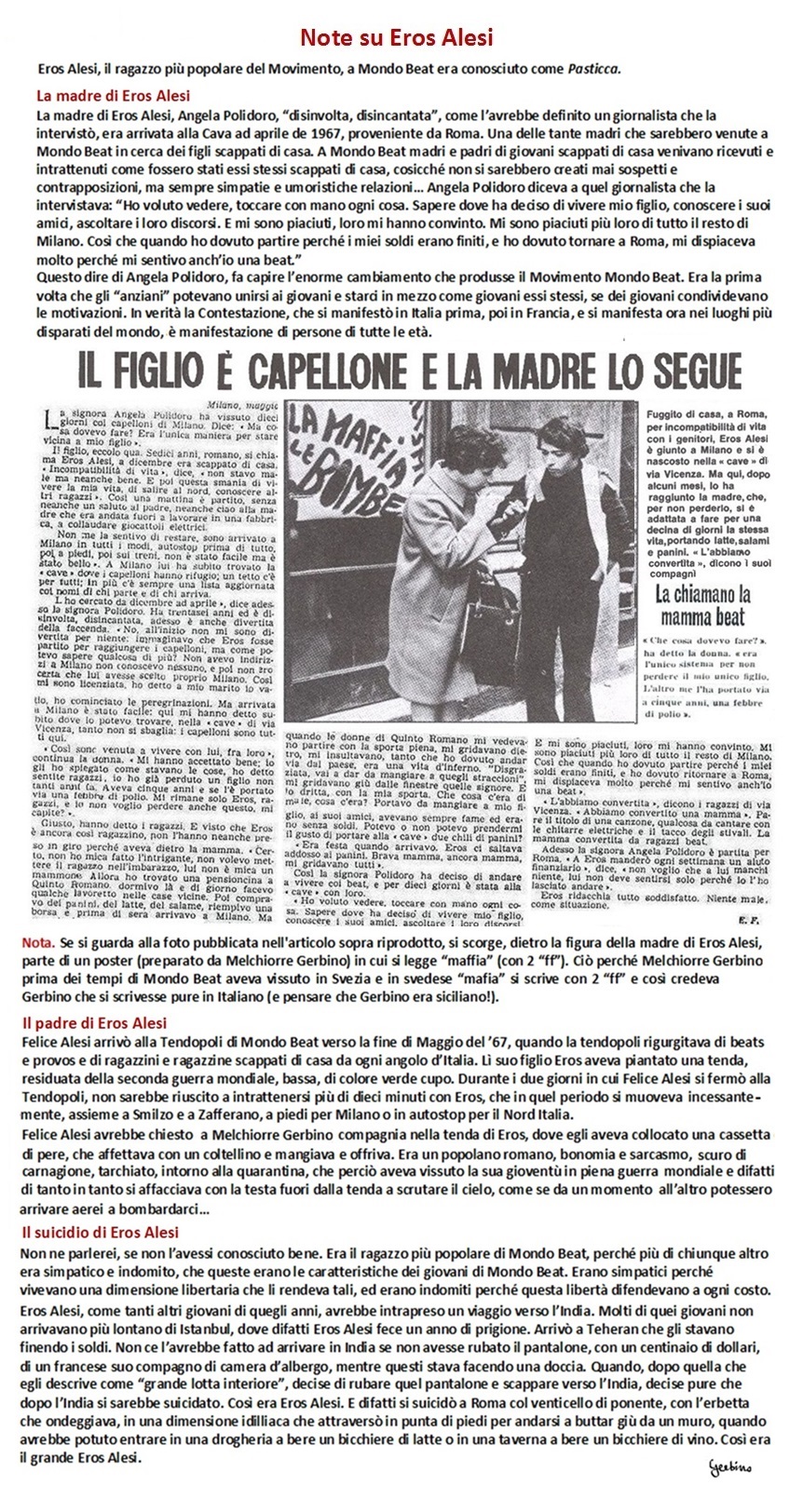 La madre di Eros Alesi, Angela Polidoro, sarebbe venuta a inizi maggio del 67 da Roma a Milano, per incontrarlo. Lei aveva creduto che Eros, che era scappato di casa, si nascondesse a Roma e lì lo aveva a lungo cercato, ma poi qualcuno l'avrebbe informata che Eros frequentava la Cava di Mondo Beat a Milano.