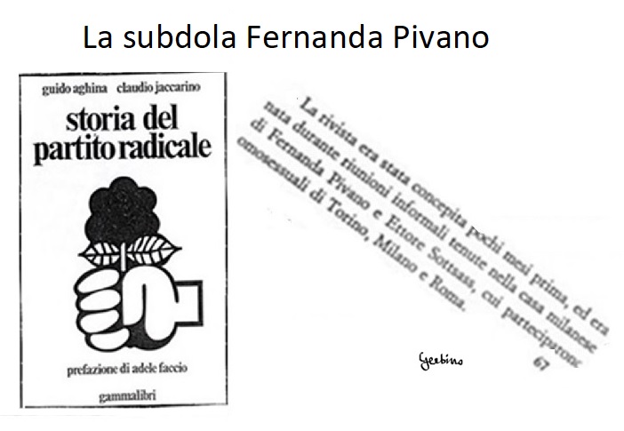 Ai tempi di Mondo Beat, quando i giovani del Movimento si battevano per i diritti civili, manifestando perché venisse abrogato il "Codice Rocco", ancora in vigore dai tempi del Fascismo, per cui a insindacabile giudizio della polizia si poteva privare della libertà di movimento un cittadino incensurato, contestandogli un foglio di via obbligatorio per il suo paese di residenza e diffidandolo dal soggiornare per 5 anni in Milano, pena un mese di carcere, poi tre se recidivo, poi sei... e quando i giovani del Movimento si impegnavano, come a Firenze, al recupero di parte del patrimonio culturale dell'umanità, allora essi erano per Fernanda Pivano "ragazzi di strada che facevano sottocultura". Poi, quando Mondo Beat fu disciolto e Melchiorre Gerbino si rimise a viaggiare per il mondo, allora Fernanda Pivano promosse tempestivamente, tra i giovanissimi delle scuole, tanti piccoli gruppi "Mondo Bit" e si precipitò a fondare la rivista "Pianeta Fresco", cui aderirono tante illustrissime firme, acciosiacosacchè si creasse un ponte tra la cultura della protesta della beat generation americana e la sottocultura dei ragazzi di strada italiani: peccato che, malgrado la grande pubblicità che gli accordarono i media, dopo due numeri Pianeta Fresco si trasformò in Pianeta Fiasco e ora pudicamente Fernanda Pivano non lo menziona più nella sua biografia. Poi, non vuoi che a casa sua intellettuali omosessuali si riunivano per fondare un movimento gay e Fernanda Pivano, con una folgorazione da genio, suggerì loro di chiamarlo F.U.O.R.I.!, come sta scritto in pubblicazioni autorevoli?! Veramente però "Fuori" era il titolo di due articoli, apparsi in due numeri consecutivi nella rivista Mondo Beat, scritti da Renè Vento, il primo gay italiano dichiarato... E intanto scriveva e parlava di "protesta" della beat generation americana, Fernanda Pivano, e citava Allen Ginsberg, che aveva detto (traduzione di Fernanda Pivano): "Di tutti i beatniks del mondo quelli che mi fanno più tenerezza sono quelli italiani, perché protestano per qualcosa che, nella migliore delle ipotesi, vedranno soltanto i loro figli" (notare bene che Allen Ginsberg diceva e Fernanda Pivano traduceva "protestano"). E poi, nel 1976, dieci anni dopo la fondazione di Mondo Beat, Fernanda Pivano non dava alle stampe, con la casa editrice Arcana, l'opera "C'era una volta un beat. 10 anni di ricerca alternativa"?! E che opera! I ragazzi di strada italiani che avevano fatto sottocultura, nella sua memoria avevano subito una metamorfosi ed erano ricordati come soggetti politici coscienti, grazie a lei che l' 1 Novembre 1966 a Verona aveva presentato Vittorio Di Russo e Melchiorre Gerbino al compagno Bertani, che aveva spiegato loro il programma dello P.S.I.U.P. (Partito Socialista di Unione Proletaria)! E a riprova di ciò Fernanda Pivano riproduceva nel libro un fotomontaggio, così mal fatto che pure uno scemo si poteva accorgere che era un fotomontaggio, in cui l'immagine di Vittorio Di Russo e la mia erano inserite in un contesto di persone a me sconosciute, tra cui questo Bertani. In verità quell' 1 Novembre 1966, quando ancora noi di Mondo Beat e la Pivano "ci si annusava", eravamo stati a Verona a bere vino a casa dell'avvocato Donà, in una collina dell'Oltreadige, e Vittorio Di Russo, come può essere constatato nei registri del pronto soccorso dell'ospedale, dove io stesso lo accompagnai, aveva avuto un raptus etilico: altro che PSIUP!... Questo pubblicava Fernanda Pivano 10 anni dopo la fondazione di Mondo Beat. Poi, col passare ancora degli anni, Fernanda Pivano FINALMENTE CAPÌ che i testi che lei aveva tradotto e introdotto in Italia sulla protesta della beat generation americana storicamente non valevano un fico secco, perché in Italia e in Francia la storia l'aveva fatto La Contestazione! E allora che fece Fernanda Pivano?... Signor Presidente, provi a indovinare!... Ma fece una cosa semplice e geniale! Non scrisse più di "protesta" della beat generation americana ma cominciò a scrivere di "contestazione" della beat generation americana, contestazione che grazie a lei era stata poi portata in Italia!