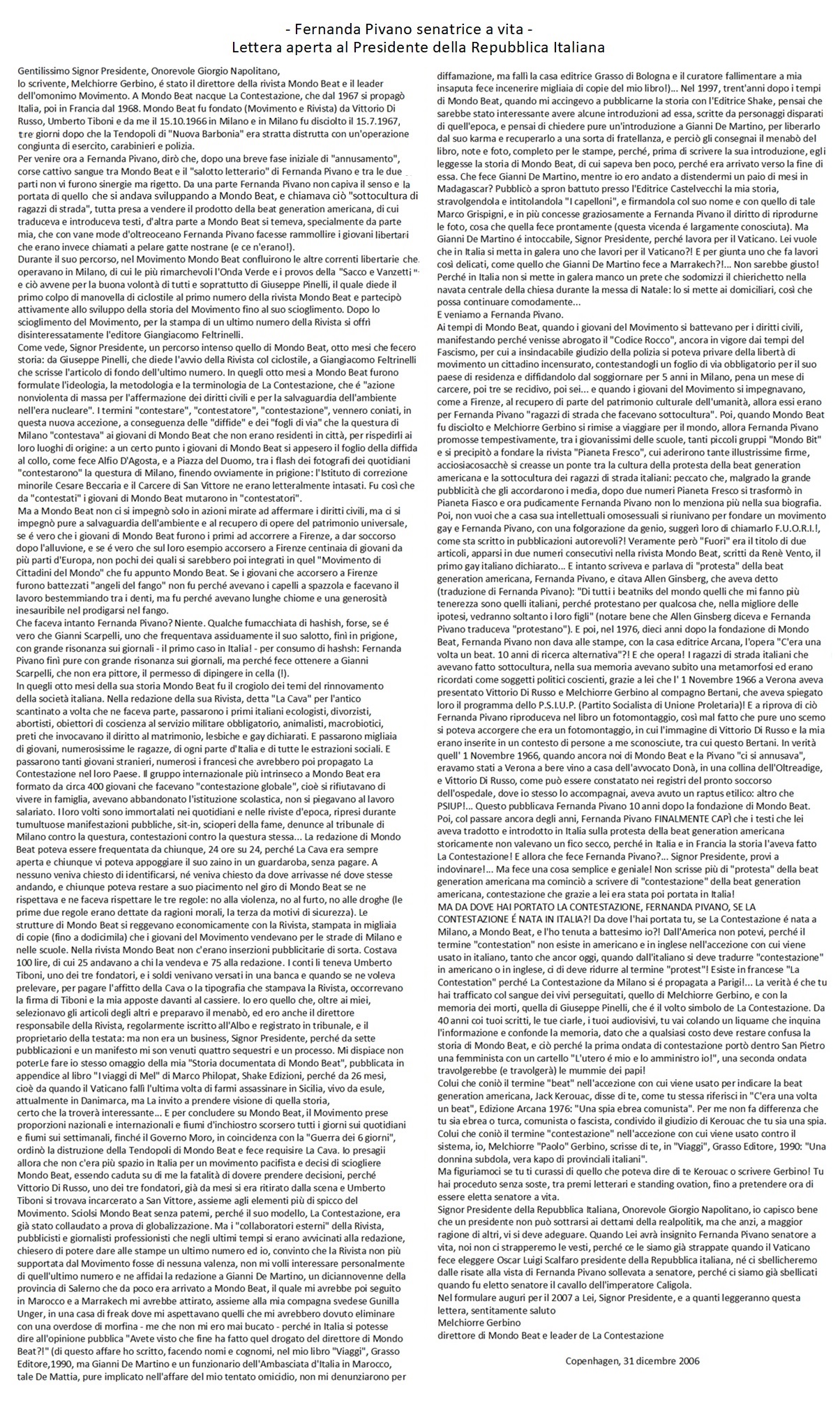 Signor Presidente della Repubblica Italiana, Onorevole Giorgio Napolitano, io capisco bene che un presidente non può sottrarsi ai dettami della realpolitik, ma che anzi, a maggior ragione di altri, vi si deve adeguare. Quando Lei avrà insignito Fernanda Pivano senatore a vita, noi non ci strapperemo le vesti, perché ce le siamo già strappate quando il Vaticano fece eleggere Oscar Luigi Scalfaro presidente della Repubblica italiana, né ci sbellicheremo dalle risate alla vista di Fernanda Pivano sollevata a senatore, perché ci siamo già sbellicati quando fu eletto senatore il cavallo dell'imperatore Caligola.