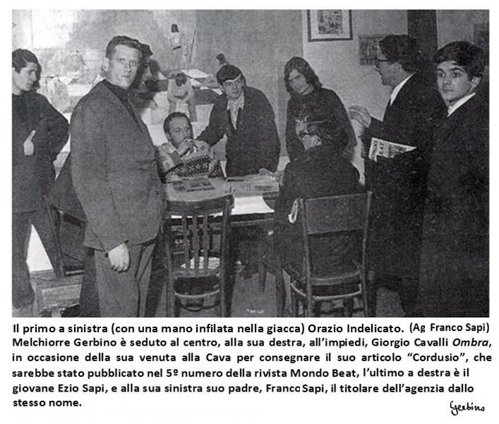 In questa foto, il primo a sinistra, con una mano infilata nella giacca, è Orazio Indelicato. Melchiorre Gerbino è seduto al centro, alla sua sinistra, all'impiedi, Giorgio Cavalli Ombra; l'ultimo a destra è il giovane Ezio Sapi e alla di lui sinistra, che regge una copia di Mondo Beat sottobraccio, è suo padre, Franco Sapi, titolare dell'omonima agenzia.
