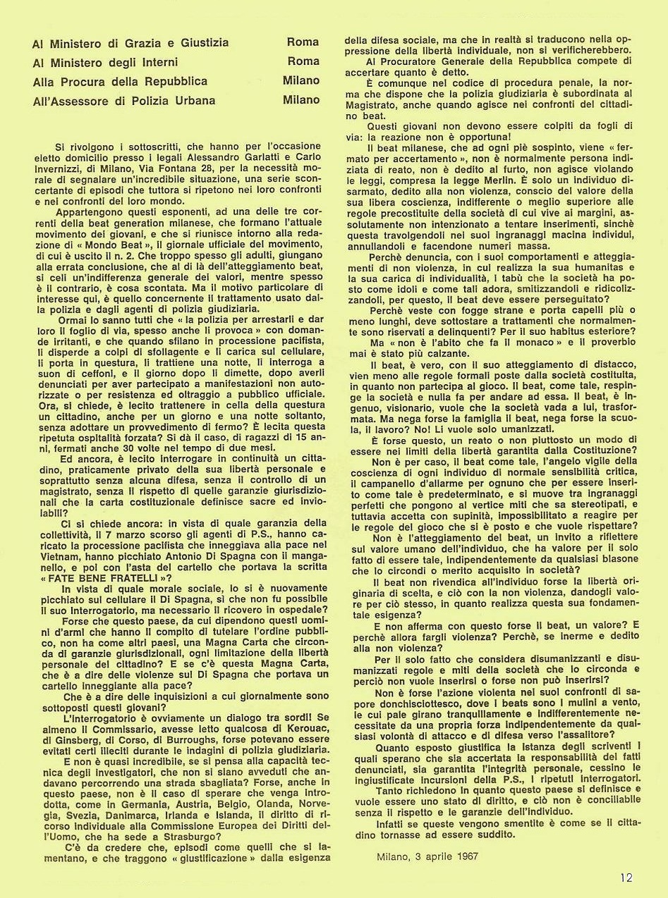 Il documento, corredato da dettagliate denunce di vessazioni e violenze che giovani del Movimento Mondo Beat avevano subito da agenti della Questura di Milano, fu preparato dagli avvocati Alessandro Garlatti e Carlo Invernizzi e sottoscritto da interessati e testimoni.