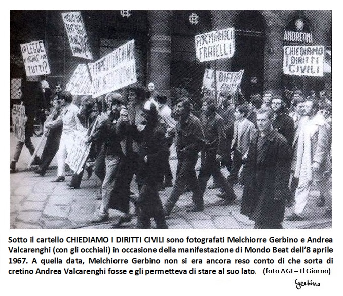 in occasione della manifestazione di Mondo Beat dell'8 aprile 1967. A quella data, Melchiorre Gerbino non si era ancora reso conto di come Andrea Valcarenghi fosse un cretino maligno (come vedremo) e gli permetteva di stare al suo lato.