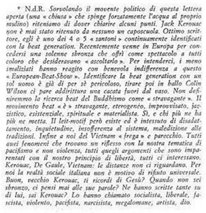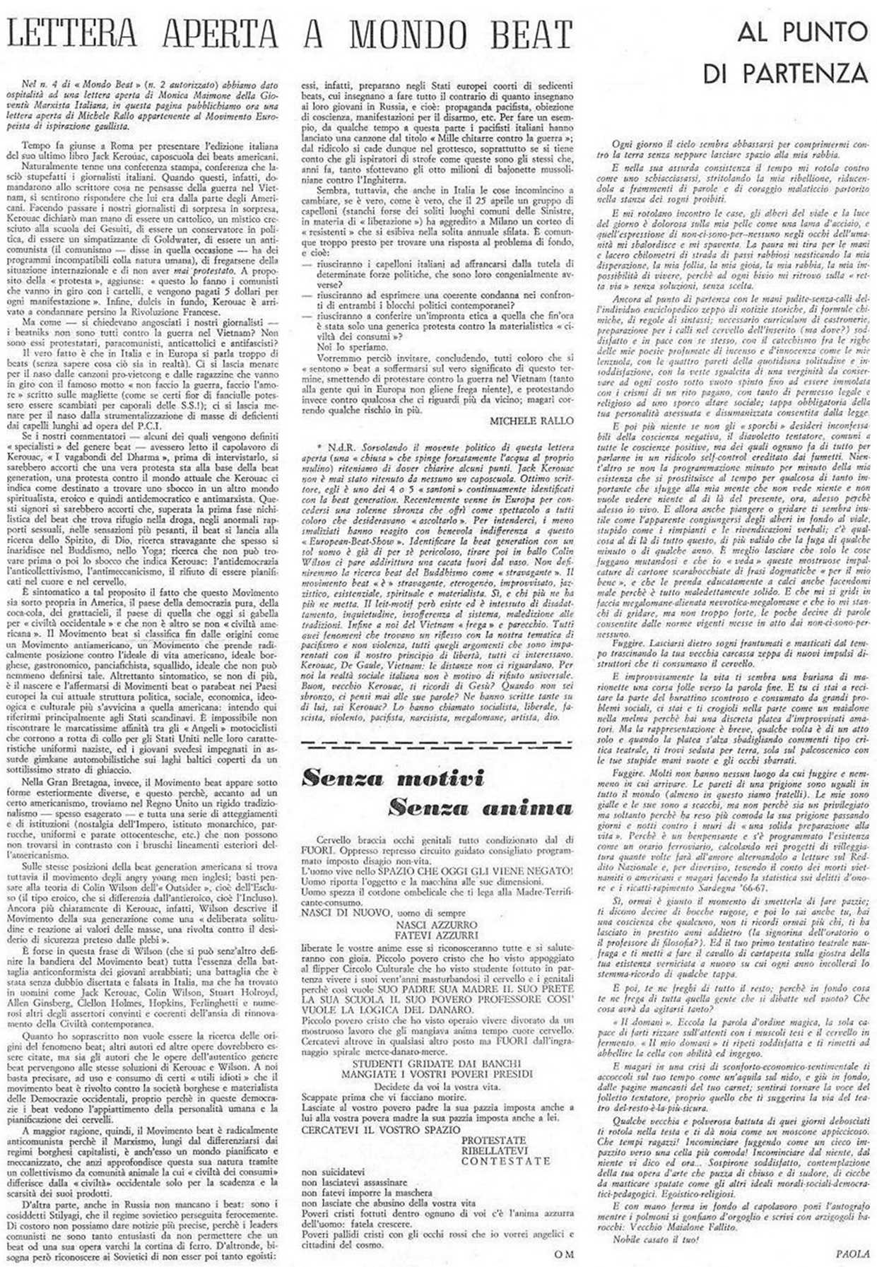 "LETTERA APERTA A MONDO BEAT" di Michele Rallo, un giovane fascista che non si rendeva conto della natura anarchica del Movimento Mondo Beat e credeva fosse influenzato dai comunisti e perciò stupidamente ci spiegava come Jack Kerouac e altri personaggi della Beat Generation comunisti non fossero.