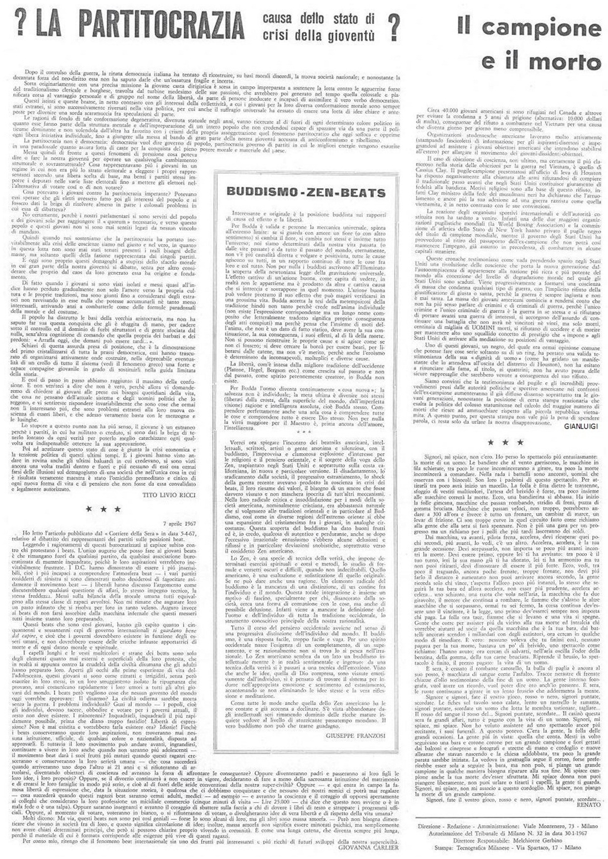 In questo articolo egli affrontava il tema della crisi del buddismo zen in America. Più pertinente agli scenari della Contestazione sarebbe stato affrontare il tema della crisi del pioppo in Lombardia, che la scomparsa delle pioppaie, causa l’invasione dei prodotti plastici, si notava nello sfondo del quadro della Contestazione, mentre della crisi del buddismo zen in America non s’intravedeva ombra. Ma Franzosi era un eccentrico!... Sempre facendo surf sulla cresta delle onde, egli, dopo quella di Mondo Beat, avrebbe cavalcato l’onda della pornografia con lo pseudonimo Doctor Pinus. Di onda in onda sarebbe infine approdato in una di quelle taverne di mare denominate libera università, a farci il luminare... Un vero peccato che non abbia fatto il venditore di tappeti, avrebbe guadagnato di più e sarebbe apparso in qualche televisione locale.
