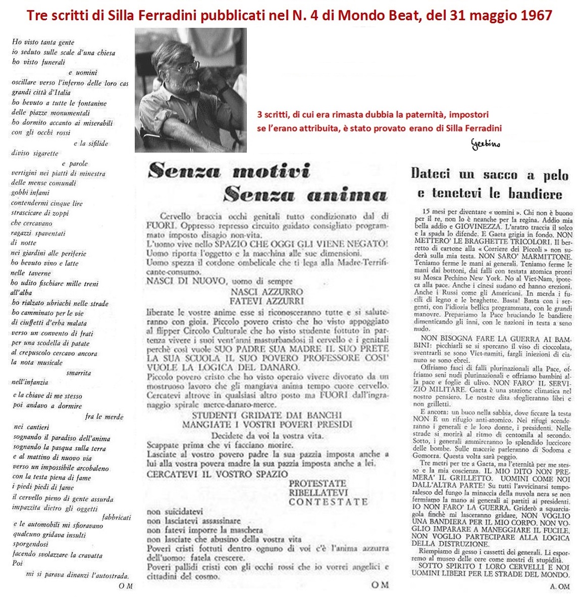 Nota. Silla Ferradini firmava i suoi scritti con sigle e li faceva pervenire alla redazione di Mondo Beat anonimamente; più avanti spiegheremo la ragione di ciò. Di questi tre scritti pubblicati in questo numero, due a firma "OM", uno "A.OM", era rimasta dubbia la paternità, alcuni impostori avevano cercato di attribuirsela, ma recentemente è stato accertato come essi fossero di Silla Ferradini (giusta di glorie dispensiera è morte).