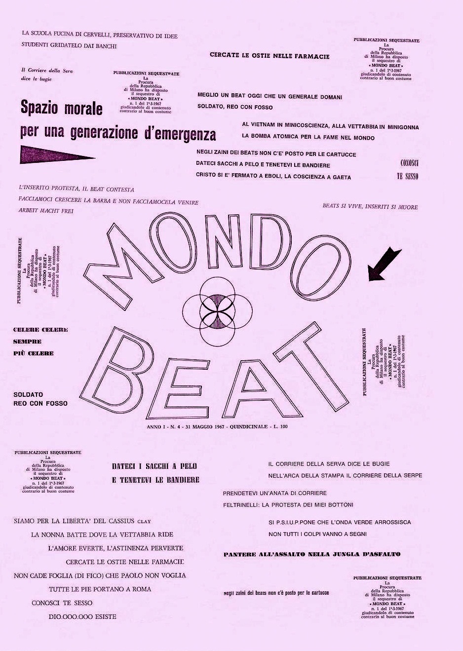 MEGLIO UN BEAT OGGI CHE UN GENERALE DOMANI alludeva al colpo di stato in Grecia, compiuto da una giunta di generali proprio in quell’aprile del 1967, e alla funzione cui assolveva il Movimento Mondo Beat nel prevenirne uno in Italia;