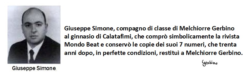 Con l'acquisto della rivista Mondo Beat, Giuseppe Simone, che era un gentiluomo, avrebbe trovato modo di fornire denaro all'amico Melchiorre Gerbino, perché potesse tornare ai suoi viaggi.