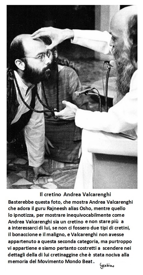 Sarebbe bastata questa foto che mostra Andrea Valcarenghi che adora il guru Rajneesh Osho, mentre quello lo ipnotizza, per mostrare inequivocabilmente come Andrea Valcarenghi sia un cretino e non stare più a interessarci di lui, se non ci fossero stati due tipi di cretini, il bonaccione e il maligno, e Andrea Valcarenghi non avesse appartenuto a questa seconda categoria, ma purtroppo vi appartiene e siamo pertanto costretti a scendere nei dettagli della di lui cretinaggine e torniamo dunque a parlare della rivista Mondo Beat, che non fu in alcun modo venduta o ceduta all'editore Giangiacomo Feltrinelli, né a nessun partito politico (alcuni l'avrebbero comprata a qualsiasi prezzo). Avvenne invece che nell'ottobre del 1967 Giuseppe Simone, commerciante di vini in Milano, che era stato compagno di Melchiorre Gerbino al ginnasio di Calatafimi, loro paese natio, lo fece contattare da un amico comune di Calatafimi, Giuseppe Bica, allora insegnante a Milano, perché gli fosse venduta, tramite questi, la rivista Mondo Beat. Avendo Melchiorre Gerbino acconsentito, Giuseppe Bica avrebbe contattato un altro amico comune di Calatafimi, Salvatore Scandariato, che esercitava l'avvocatura a Milano, perché segnalasse un notaio e ci assistesse nell'atto di compravendita.