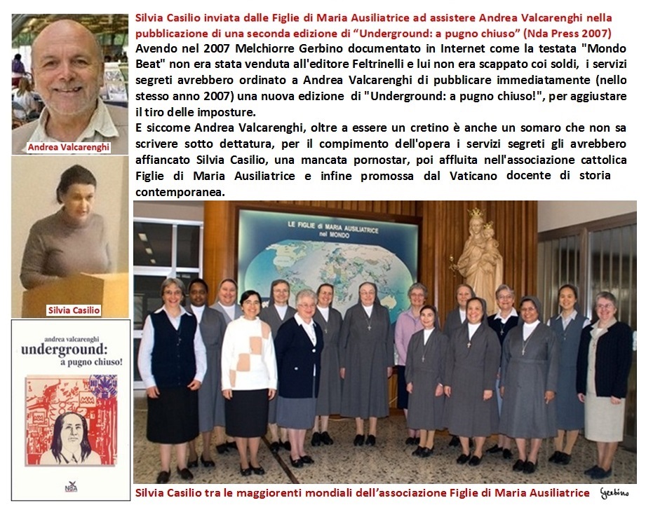 E per concludere. Allorché nel 2007 Melchiorre Gerbino ebbe pubblicato la storia di Mondo Beat nel suo sito Internet, i servizi segreti avrebbero ordinato a Andrea Valcarenghi di pubblicare immediatamente una nuova edizione di "Underground: a pugno chiuso!", (Nda Press, 2007), per aggiustare il tiro delle imposture, dato che non era più possibile sostenere che Melchiorre Gerbino aveva venduto la testata "Mondo Beat" all'editore Feltrinelli ed era scappato coi soldi, e per il compimento dell'opera i servizi segreti gli avrebbero affiancato Silvia Casilio