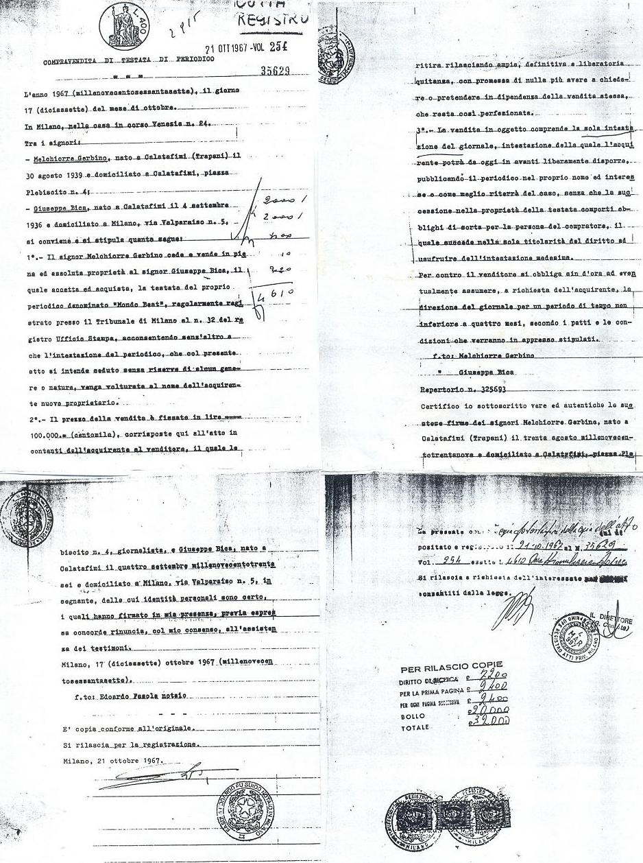 Come si può leggere all'inizio dell'atto notarile, la testata "Mondo Beat" fu venduta il 17 ottobre 1967, mentre la stampa dell'ultimo numero della rivista Mondo Beat era avvenuta, in una tipografia dell'editore Giangiacomo Feltrinelli, a fine luglio 1967, cioè all'incirca tre mesi prima della vendita della testata.