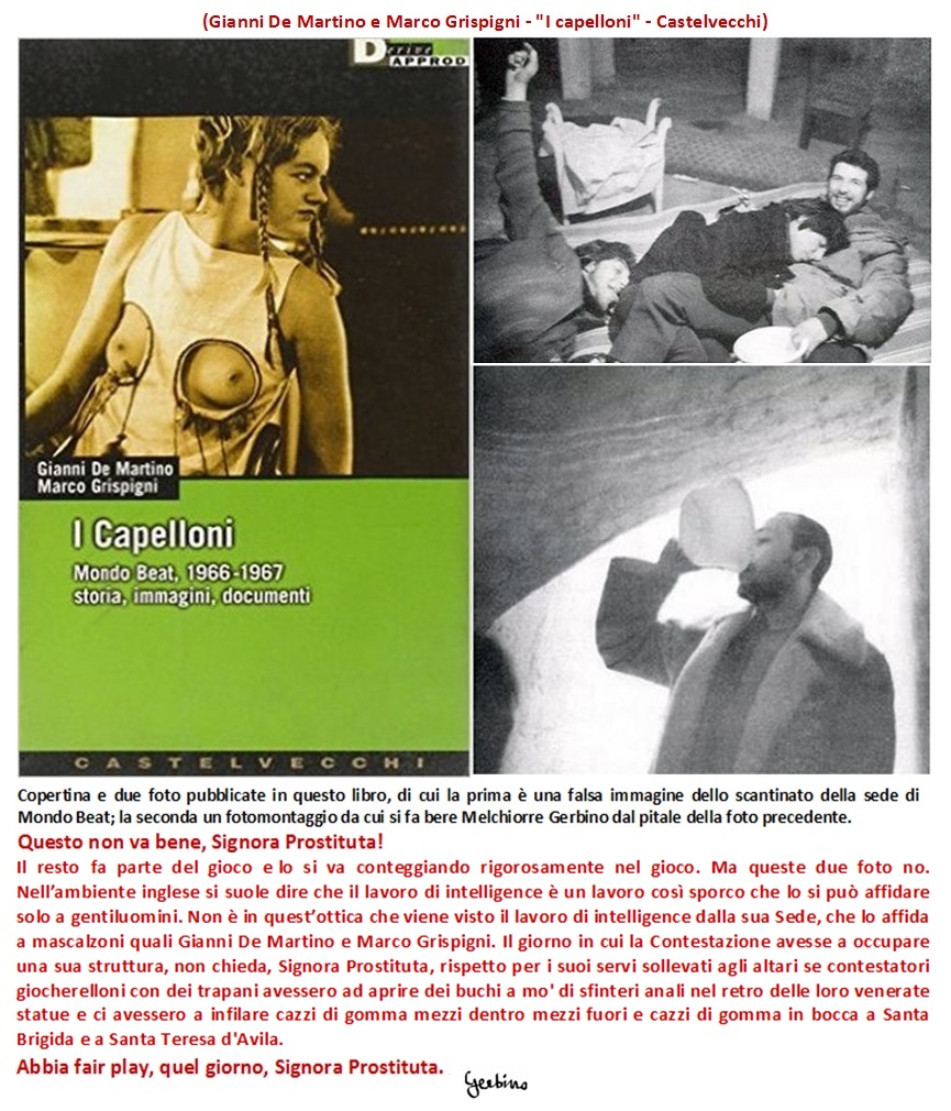 Nell’ambiente inglese si suole dire che il lavoro di intelligence è un lavoro così sporco che lo si può affidare solo a gentiluomini. Non è in quest’ottica che viene visto il lavoro di intelligence dalla sua Sede, che lo affida a mascalzoni quali Gianni De Martino e Marco Grispigni. Il giorno in cui la Contestazione avesse a occupare una sua struttura, non chieda, Signora Prostituta, rispetto per i suoi servi sollevati agli altari se contestatori giocherelloni con dei trapani avessero ad aprire dei buchi a mo' di sfinteri anali nel retro delle loro venerate statue e avessero a infilarci cazzi di gomma mezzi dentro mezzi fuori e cazzi di gomma in bocca a Santa Brigida e a Santa Teresa d'Avila.