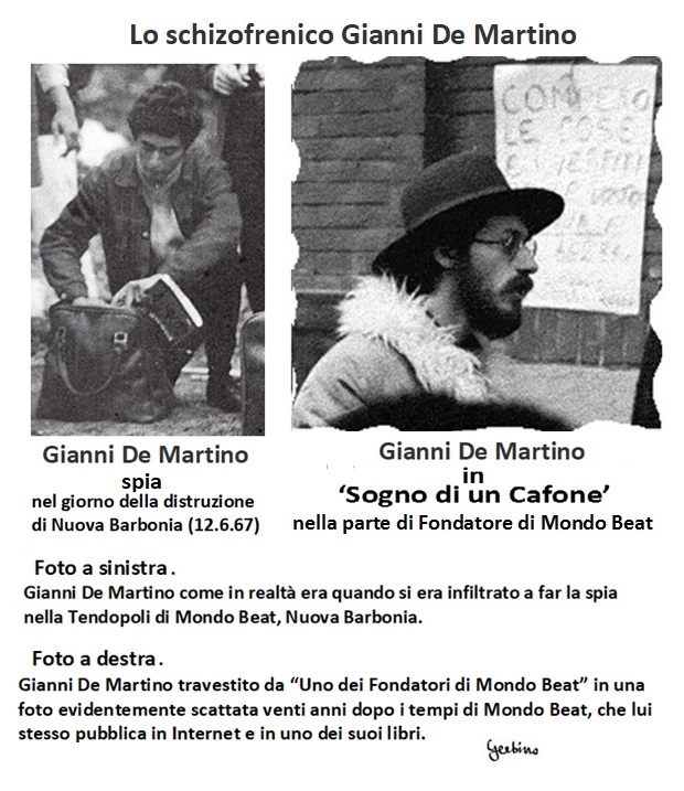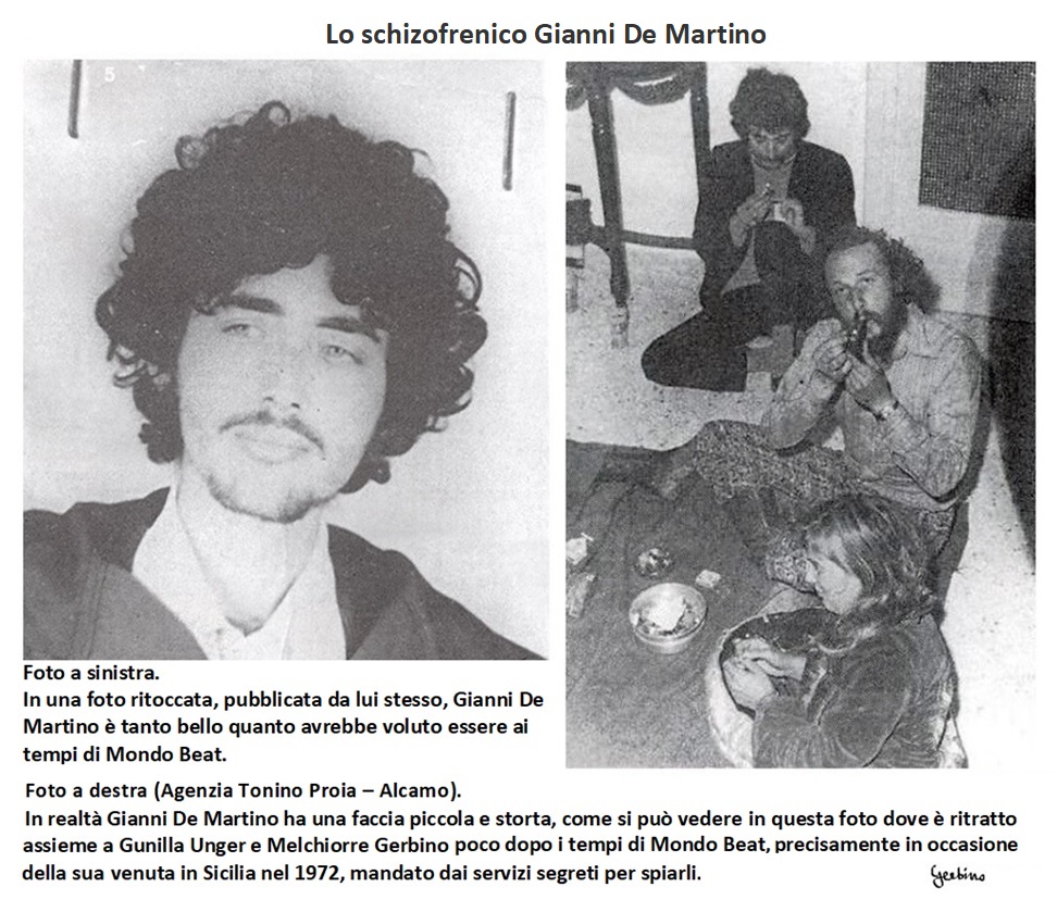 Ma, alla fine dei conti, l'azione di tutti costoro si sarebbe rivelata benefica a diffondere la vera storia di Mondo Beat, piuttosto che il contrario, perché costoro avrebbero fatto interessare molte persone a quella storia e se uno si interessa alla storia di Mondo Beat per forza di cose deve andare a cercare di Melchiorre Gerbino, che appare in centinaia di articoli della stampa italiana d'epoca e appare in quella internazionale e in tante Getty Images. Trascuriamo dunque questi poveri diavoli e torniamo a Gianni De Martino per concludere con la di lui storia personale. E diciamo che, all'apice della sua carriera di agente di collegamento tra la Santa Sede e il Mossad, e mentre era al centro di una rete di impostori che trivializzavano la storia di Mondo Beat e della Contestazione, Gianni De Martino avrebbe cominciato a manifestare segni di follia.