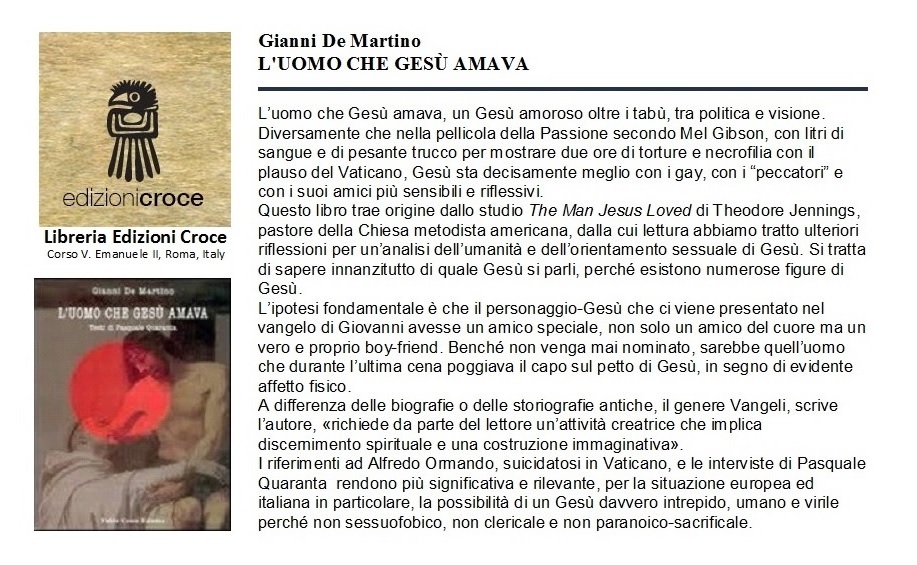 Gianni De Martino, "L'uomo che Gesù amava". Nella copertina di questo trattato viene mostrato Gesù col maschio con cui si intratteneva