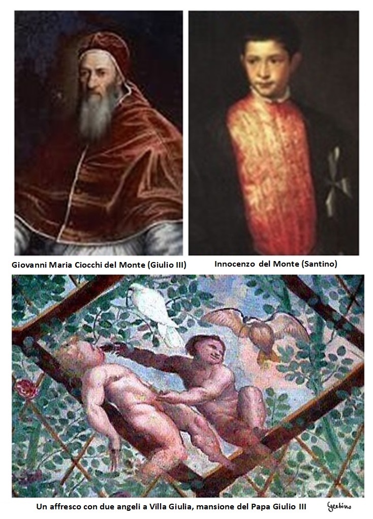 Ritratti di Giulio III e Santino e un affresco a Villa Giulia, mansione del Papa, dove sono raffigurati due angeli. Giulio III, inquisitore e pederasta, è l'archetipo del sacerdote cattolico moderno.