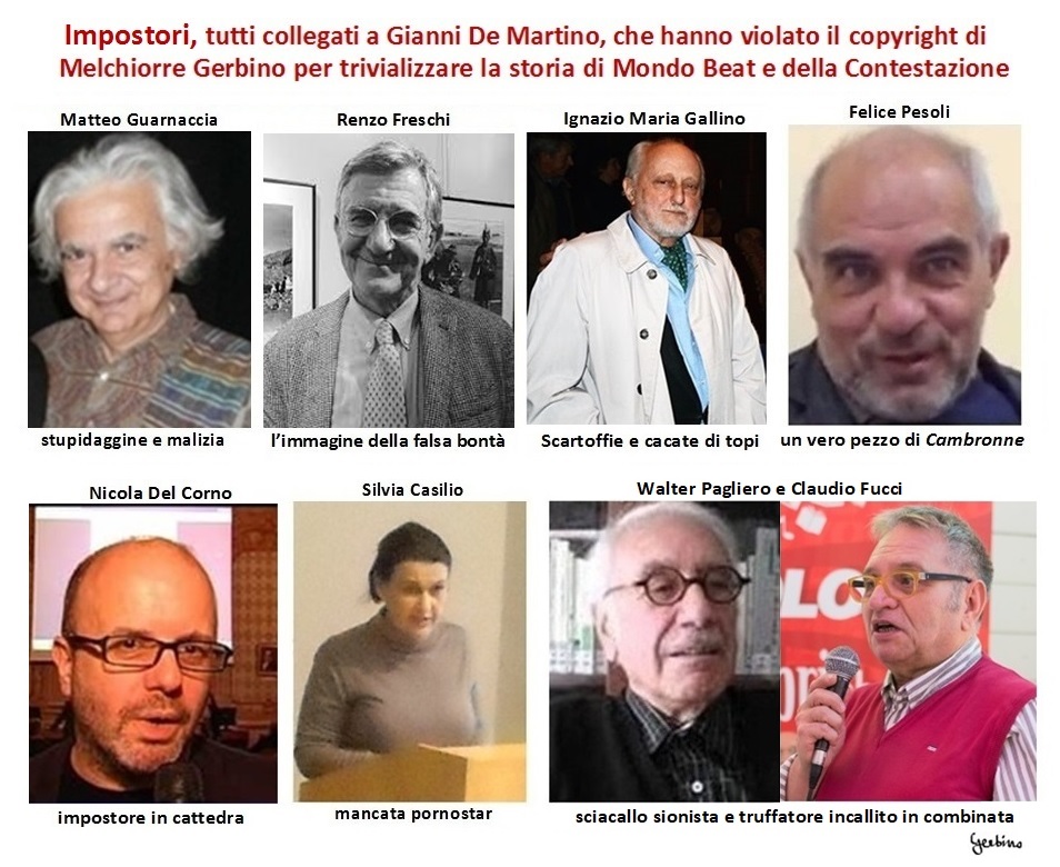 E continuando a seguire gli sviluppi della campagna mediatica voluta dal Vaticano a mistificare e disperdere la memoria di Mondo Beat, vediamo qui un assemblaggio di impostori che in concorso con Gianni De Martino si sarebbero adoperati a tanto. Si tratta di malfattori, che avrebbero violato il copyright di Melchiorre Gerbino per fare il loro lavoro sporco, costoro non avendo avuto timori di conseguenze giudiziarie, in Italia il Vaticano gestendo la magistratura.