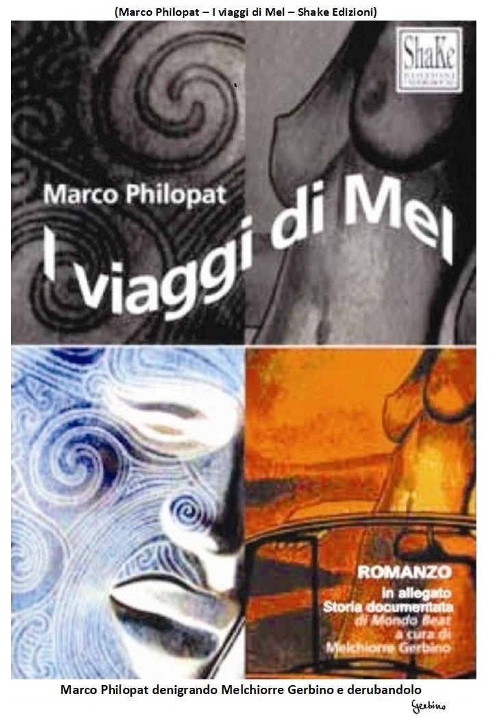 Intanto Gianni De Martino si sarebbe recato da Marco Philopat per consigliarlo su cosa scrivere della vita di Melchiorre Gerbino nel libro che stava preparando, e Marco Philopat, terrorizzato, avrebbe stravolto la storia della vita di Melchiorre Gerbino. Lo avrebbe rappresentato in situazioni che non sono mai occorse, gli avrebbe fatto dire cose che non ho mai detto, lo avrebbe tratteggiato fannullone, opportunista, paranoico e drogato: quanto di più il Vaticano non avrebbe potuto pretendere. Per potersi dilungare 38 pagine di più in quest’opera, Marco Philopat avrebbe tolto arbitrariamente 38 pagine dalla "Storia documentata di Mondo Beat" di Melchiorre Gerbino. Essendo certo che Melchiorre Gerbino sarebbe stato ucciso a Calatafimi, Marco Philopat avrebbe pubblicato il volume intitolandolo solo "I viaggi di Mel" e firmandolo solo col suo nome, e la "Storia documentata di Mondo Beat" di Melchiorre Gerbino, amputata di 38 pagine, sarebbe diventata un "allegato". Nelle interviste Marco Philopat avrebbe dichiarato che aveva ricostruito la storia della vita di Melchiorre Gerbino avendo sbobinato centinaia di ore di registrazioni dei di lui racconti orali, quando in realtà non lo aveva registrato nemmeno due ore (Ce le faccia sentire queste centinaia di ore di interviste registrate). E finalmente, essendo Melchiorre Gerbino riuscito a non farsi ammazzare a Calatafimi e avendo raggiunto Parigi, dove avrebbe conosciuto l’editore Jean-François Knidler, cui avrebbe parlato della sua situazione, e avendo l’editore Knidler telefonato alla Casa editrice Shake, Marco Philopat avrebbe detto all'editore Knidler che Melchiorre Gerbino era pazzo, perché a Calatafimi non aveva corso nessun rischio.