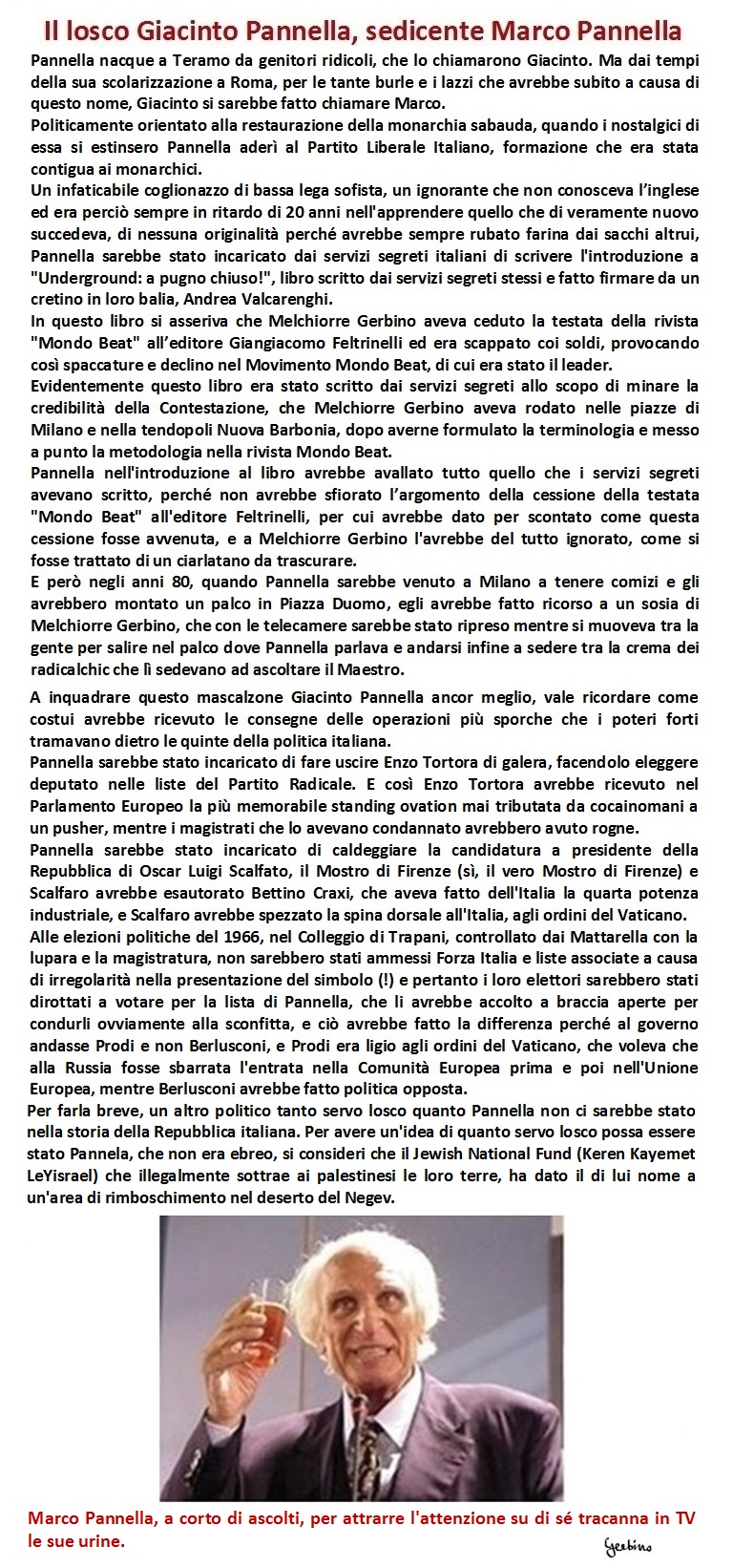 Per farla breve, un altro politico tanto servo losco quanto Pannella non ci sarebbe stato nella storia della Repubblica italiana. Per avere un'idea di quanto servo losco possa essere stato Pannela, che non era ebreo, si consideri che il Jewish National Fund (Keren Kayemet LeYisrael) che illegalmente sottrae ai palestinesi le loro proprietà, ha dato il di lui nome a un'area di rimboschimento nel deserto del Negev.