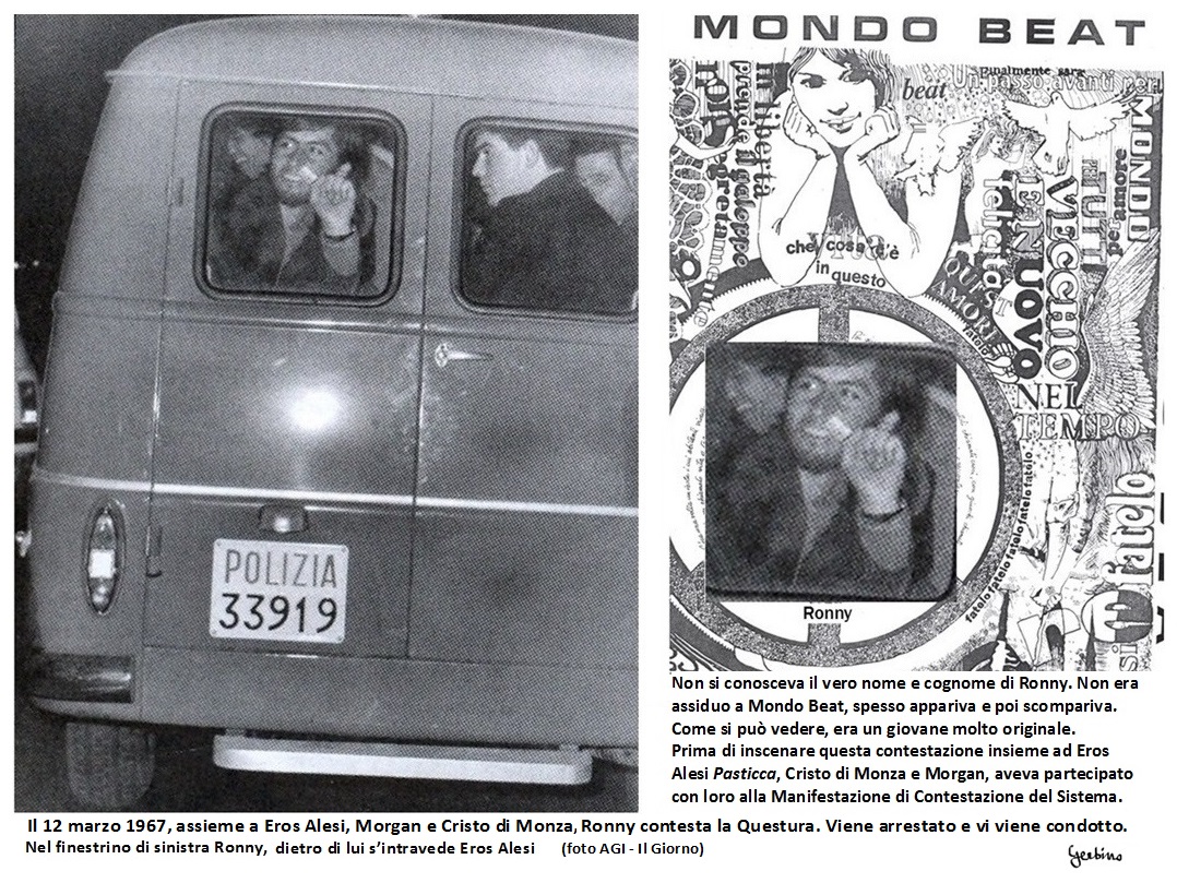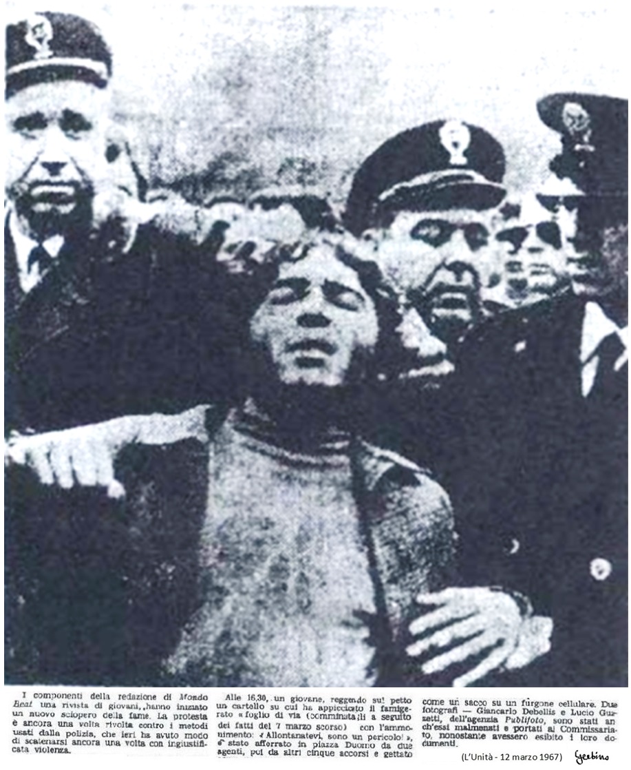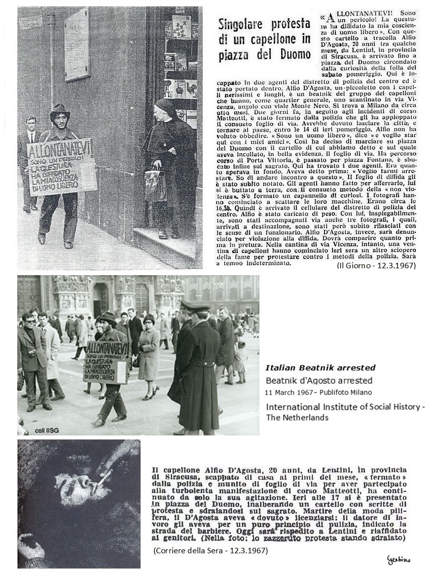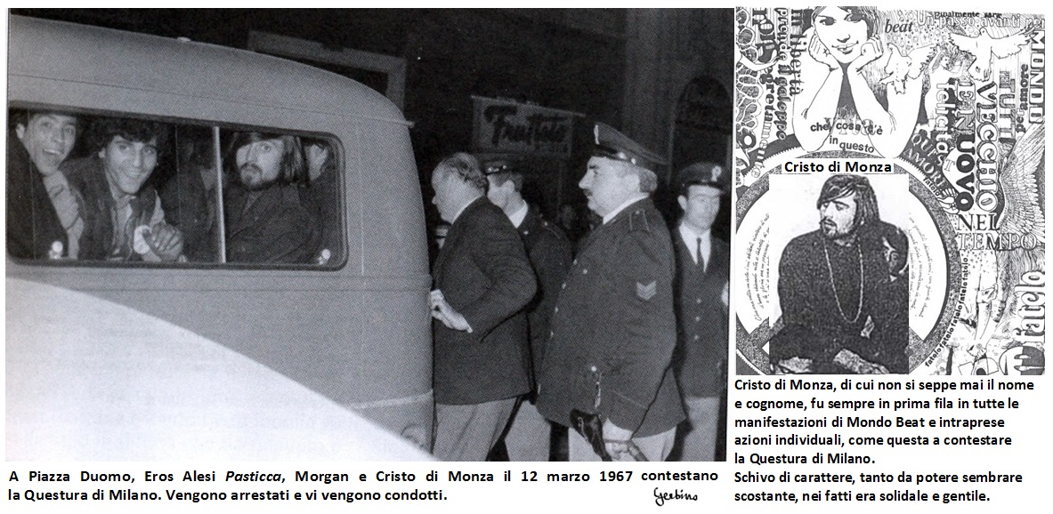 I quattro, che contestarono la Questura in Piazza Duomo, non avevano ricevuto il foglio di via obbligatorio perché erano residenti a Milano, ma avrebbero potuto comunque finire in prigione col pretesto di "resistenza a pubblico ufficiale". Queste due foto sono le più divertenti della storia di Mondo Beat. Osservare le facce di quelli che venivano arrestati e di quelli che li arrestavano.