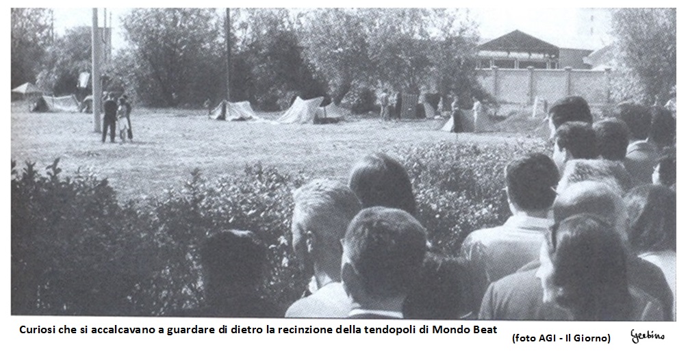 Non era gente locale, ma persone che venivano da altrove per curiosare, perché la tendopoli era situata nei campi e intorno non c'era popolazione densa, solo pochi caseggiati e alcune fabbriche. Questa foto fu scattata poco tempo dopo l'apertura del campeggio. Coi giorni, la gente che sarebbe venuta a curiosare sarebbe diventata tanta che avrebbe ingombrato il piazzale di rifornimento di benzina adiacente la tendopoli, intralciandovi la normale attività. Questo perché, anche se non tutte le famiglie avevano un figlio o una figlia che erano fuggiti di casa per unirsi ai beats, tuttavia c'era qualche caso tra i loro parenti o amici e quindi la gente comune sapeva che i giovani fuggivano di casa per partecipare a una rivoluzione esistenziale. Riguardo a questa rivoluzione, le reazioni che le persone comuni avrebbero manifestato sarebbero state originali, ognuno ne avrebbe manifestata una sua particolare, in una gamma di sentimenti che si sarebbero espressi dal rigetto assoluto all'indulgenza compiacente, ma nessuno avrebbe mostrato indifferenza verso il fenomeno della rivolta della gioventù.