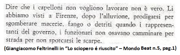 Nell’ultimo numero della rivista Mondo Beat l’editore Giangiacomo Feltrinelli, che ne scrisse l’articolo di fondo, faceva testimonianza, spontanea e sincera, di come furono i giovani di Mondo Beat ad accorrere in soccorso di Firenze subito dopo l’alluvione del novembre 1966. Qui uno stralcio di quell'articolo e, a seguire, altri di altri quotidiani sul grande afflusso di giovani a Firenze