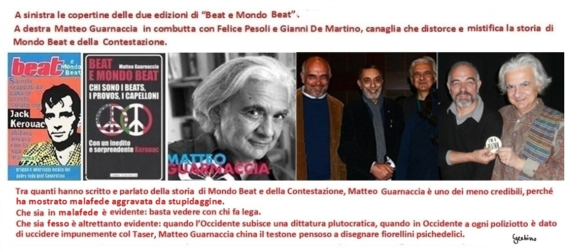 Ora, tornando a Matteo Guarnaccia, dopo che Melchiorre Gerbino ebbe pubblicata in Internet la Storia documentata di Mondo Beat (2007), l’attitudine di Matteo Guarnaccia sarebbe diventata imperdonabile perché, essendosi egli finalmente documentato, non avrebbe chiesto venia per tutto quello che fin lì aveva scritto e detto erroneamente e lacunosamente, ma si sarebbe ammantato ancor di più della veste di esperto della rivolta giovanile degli Anni 60 e ne avrebbe parlato con autorevolezza, con quella sorta di indiscutibile autorevolezza di cui si ammantano gli ignoranti. E per quanto riguarda le banalità e le lacune del suo libro "Beat e Mondo Beat", Stampa Alternativa 1969, egli avrebbe creduto che potevano essere dimenticate, o almeno mitigate, se avesse pubblicato una riedizione di quel libro, conformandosi ai dati forniti da Melchiorre Gerbino, ma ignorando lo stesso Melchiorre Gerbino, o peggio, se costretto a parlare di lui, ignorando quello che sarebbe stato essenziale dire o banalizzandolo. Così facendo, Matteo Guarnaccia avrebbe artatamente ignorato, distorto, banalizzato la storia della Contestazione, cui la storia personale di Melchiorre Gerbino è così intrinseca che l'una non può essere estrapolata dall'altra. Da lì, il passo per mettersi in combutta con degli impostori di professione sarebbe stato breve. E difatti Matteo Guarnaccia si sarebbe messo in combutta con impostori che dal Vaticano hanno avuto assegnato il compito di mistificare e banalizzare la storia di Mondo Beat. Tanto va richiedendo il Vaticano perché le generazioni italiane posteriori a quella degli Anni 60 non conoscano la vera storia di Mondo Beat, che, a conoscerla, potrebbero esserne ispirati e sollevare una nuova ondata di Contestazione, da cui il Vaticano verrebbe travolto.