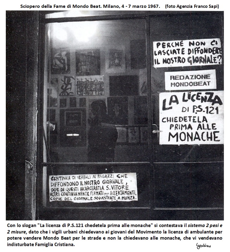 Mondo Beat era un quindicinale regolarmente registrato, ma quando cominciò a dare preoccupazioni a causa della sua linea libertaria, allora il sistema per ostacolarne la diffusione ricorse a vigili urbani che ne sequestravano le copie perché chi le vendeva per strada non era munito di licenza di venditore ambulante (Licenza n 121 del Codice di Pubblica Sicurezza). Le monache però, che quella licenza non avevano nemmeno, indisturbate potevano vendere per strada "Famiglia Cristiana". Ma dopo la Manifestazione di Contestazione del Sistema, quando ebbero capito di che pasta eravamo fatti, ci hanno lasciato vendere per strada, come fossimo stati monache.