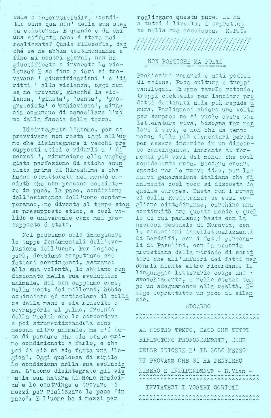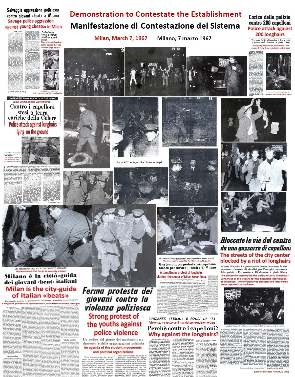 Since the Establishment was obstructing the distribution of Mondo Beat magazine, which was a regularly registered magazine, 200 young people from the Mondo Beat Movement paralyzed the center of Milan during the two hours of busiest evening traffic on a working day. An event of this kind was unprecedented in the history of Italy (and the world, I presume).
