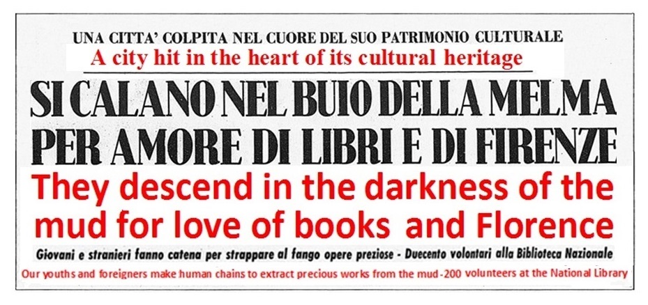 They descend in the darkness of the mud for love of books and Florence. Our youths together with young foreigners form human chains to extract precious works from the mud. 200 volunteers at the National Library.