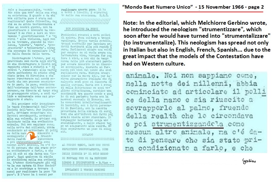 In the editorial of the first issue of Mondo Beat magazine, Melchiorre Gerbino introduced the neologism "strumentizzare", which soon after he would have turned into "strumentalizzare".
