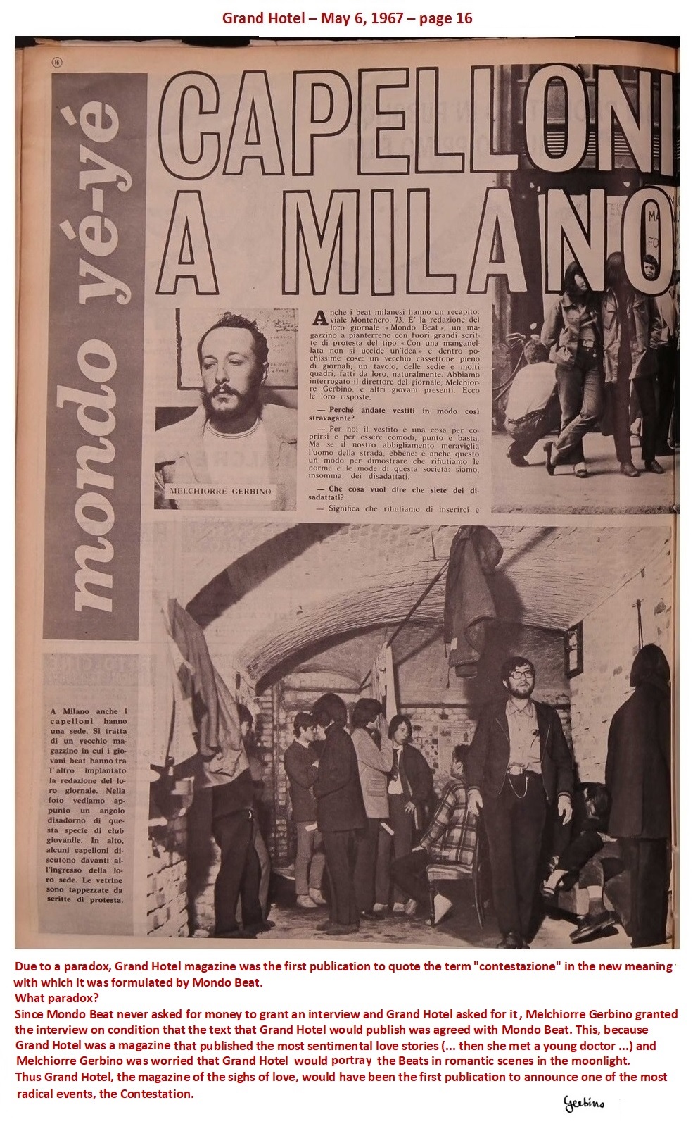 Since Mondo Beat never asked for money to grant an interview and granted it to any publication who askied for, Melchiorre Gerbino accorded the interview to Grand Hotel on condition that the text which Grand Hotel would have published was previously agreed with Mondo Beat. This, because Grand Hotel was a magazine which published the most sentimental love stories (...then Rossana met a young doctor who had lost his wife in a car accident...) and Melchiorre Gerbino feared that Grand Hotel would depict the Beats in romantic moonlight scenes.
