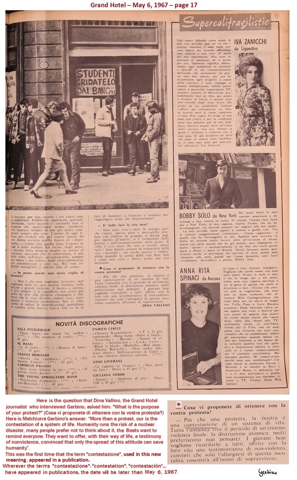 This was the first time that the term "contestazione" appeared in a publication. Wherever the terms "contestazione", "contestation", "contestación"... have appeared in publications, the date will be later than May 6, 1967.